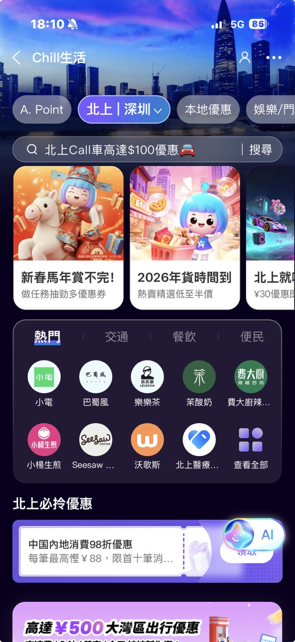 AlipayHK 作為一站式電子支付平台,除了流動支付外,App首頁上方的「Chill 生活」內設有「北上」專區,整合多款精選生活服務及優惠,無論食、玩、買、行都一應俱全,讓用戶北上出行同樣輕鬆自在,Chill 住玩、精明消費,盡享更便利的跨境生活體驗。