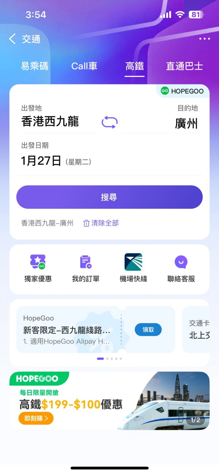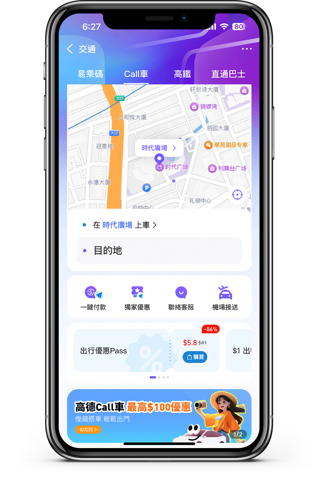 整合了滴滴出行、高德打車及Grab三大Call車平台,讓用戶無論在本地、北上南下或東南亞,都可以透過一個一站式智慧出行平台預約行程。本地更可用 AlipayHK 付款搭 Uber;北上則支援滴滴出行及高德打車;及東南亞亦可直接用 Grab Call 車,一 App輕鬆預約,全程以港幣支付,享受無縫支付體驗,真正實現一站式智慧出行。