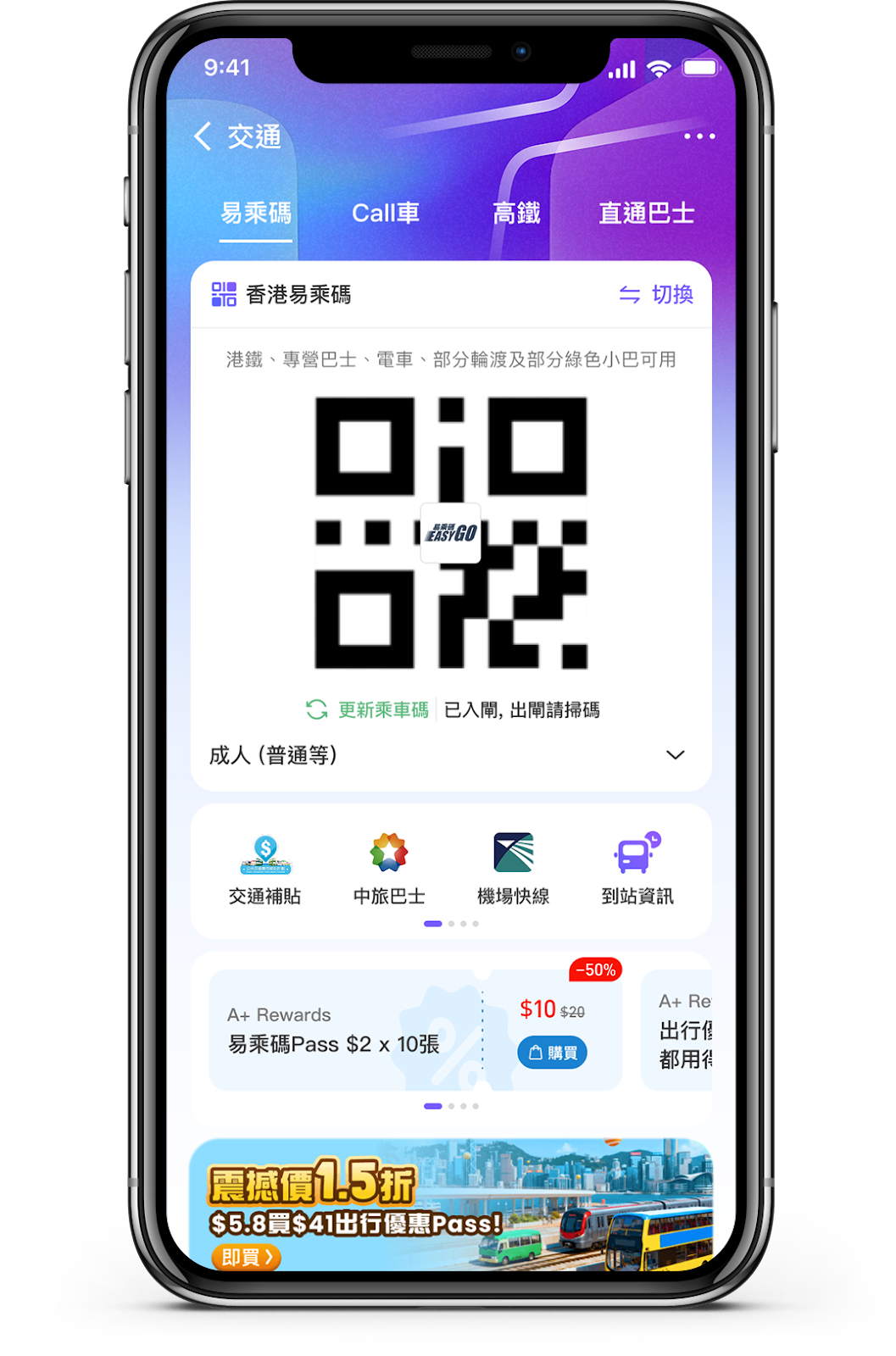 AlipayHK 電子支付已全面接入本地及跨境交通網絡,只需進入「交通」頻道,便可以使用「易乘碼」搭乘公共交通、高鐵訂票、直通巴士、Call 車、以及查詢巴士到站時間,甚至可支持港珠澳大橋收費站及易通行服務,均可透過手機輕鬆處理。更不時推出不同的交通優惠,實現一 App 通行,為用戶帶來真正無縫的智慧出行體驗。